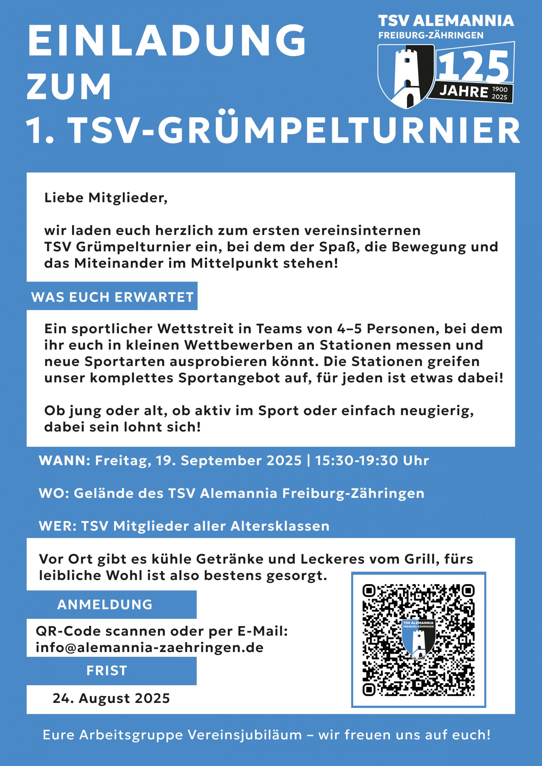 wir laden euch herzlich zum ersten vereinsinternen TSV Grümpelturnier ein, bei dem der Spaß, die Bewegung und das Miteinander im Mittelpunkt stehen!