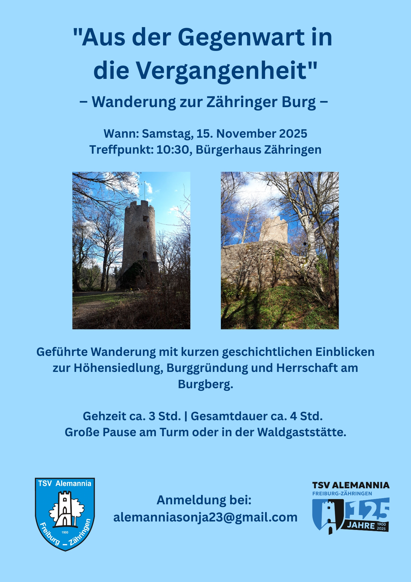 Anlässlich unseres 125-jährigen Vereinsjubiläums laden wir euch am Samstag, den 15. November 2025, zu einer besonderen Zeitreise rund um Zähringen ein, von der Gegenwart bis tief in die Geschichte des Burgbergs.